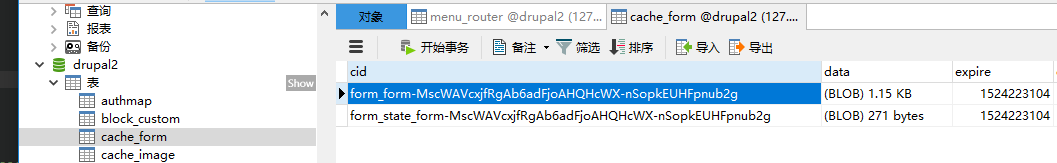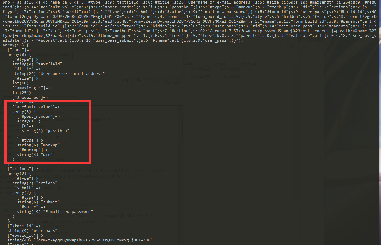 可以发现,$form['name']['#default_value'] 是直接从 $_GET['name'] 获取的,而这个注入的 $form 又是直接储存在缓存内的,那么我们将 POST 的 name 转移到 GET 中,再观察数据库中缓存的数组: