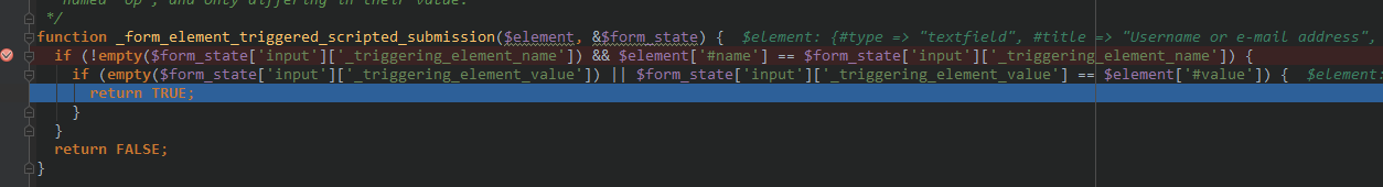 看起来形式严峻。首先我在将所有 $form_state['submitted'] 设置为 TRUE 的地方设置了断点,单步调试后发现断在了这个位置: