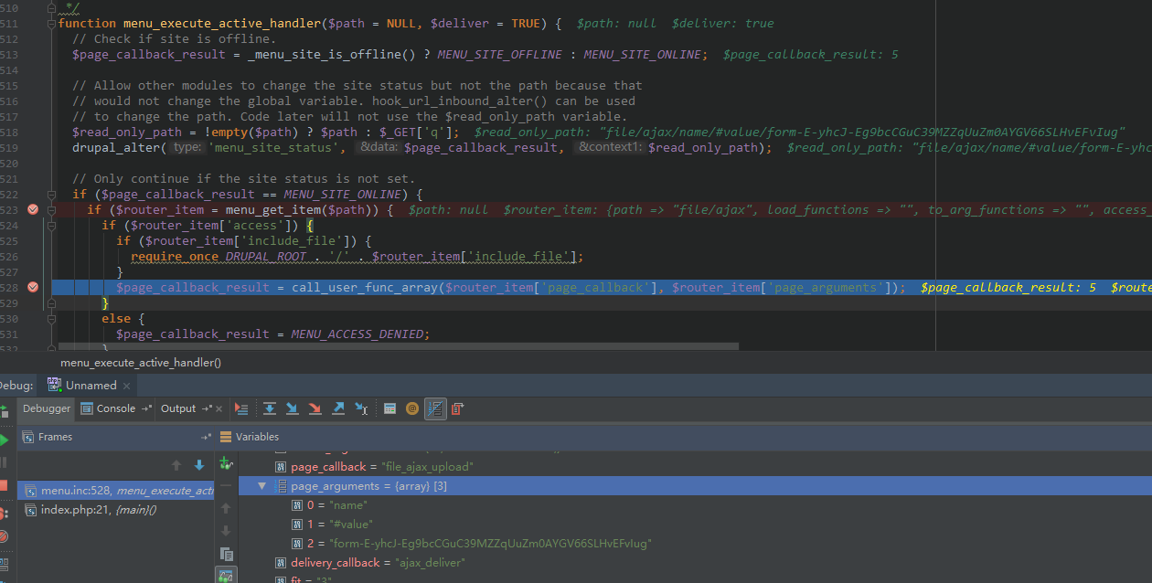 这些是什么呢?实际上这些是 Drupal 的 router,在数据库的 menu_router 表里。这么一串 array 最终和数据库中的 file/ajax 相匹配。Drupal 会根据数据库中的 page_callback 进行回调,也就是回调到 file_ajax_upload 函数。回调的现场: