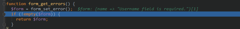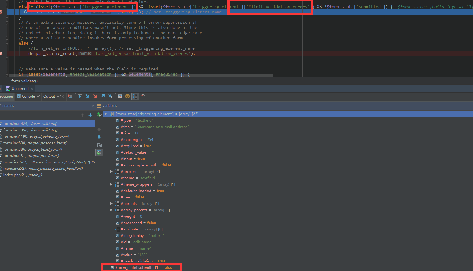 这段代码的意思是,如果用户输入的 _triggering_element_value 和 $element['#name'] 相等,那么就万事大吉了。那么,我将 POST 的 _triggering_element_name 设置成 name,在此处下一个断点,获取到的现场如下: